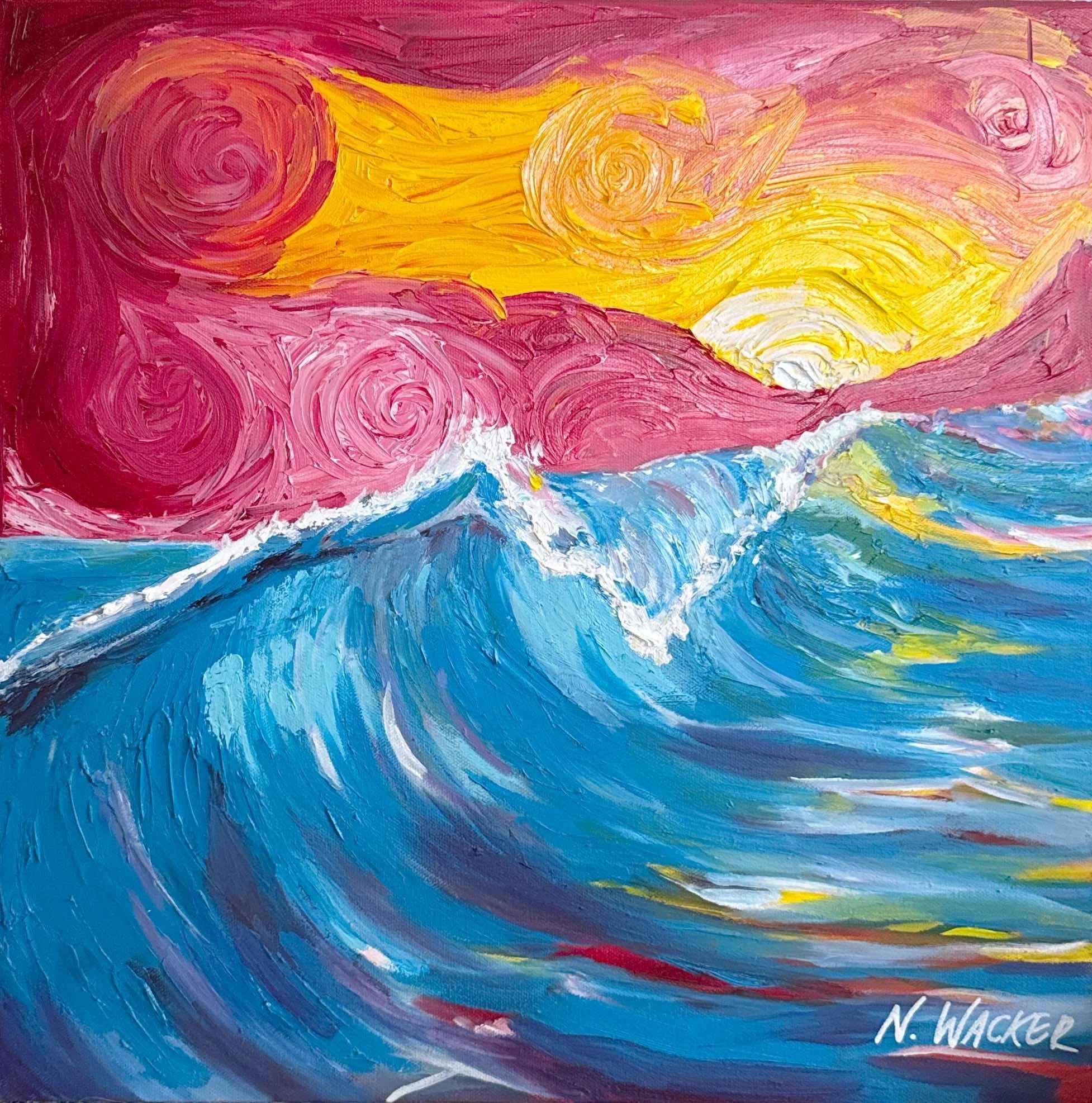 Wave Adjacent is an original oil painting pushing my explorations of waves further into the realm of abstraction. Created using palette knives it is yet another wave. I was aiming to create a scene that comes out as you - one that almost feels like it is swallowing you or enveloping you in water. Though aiming for this I wanted to keep it bright, and radiant.