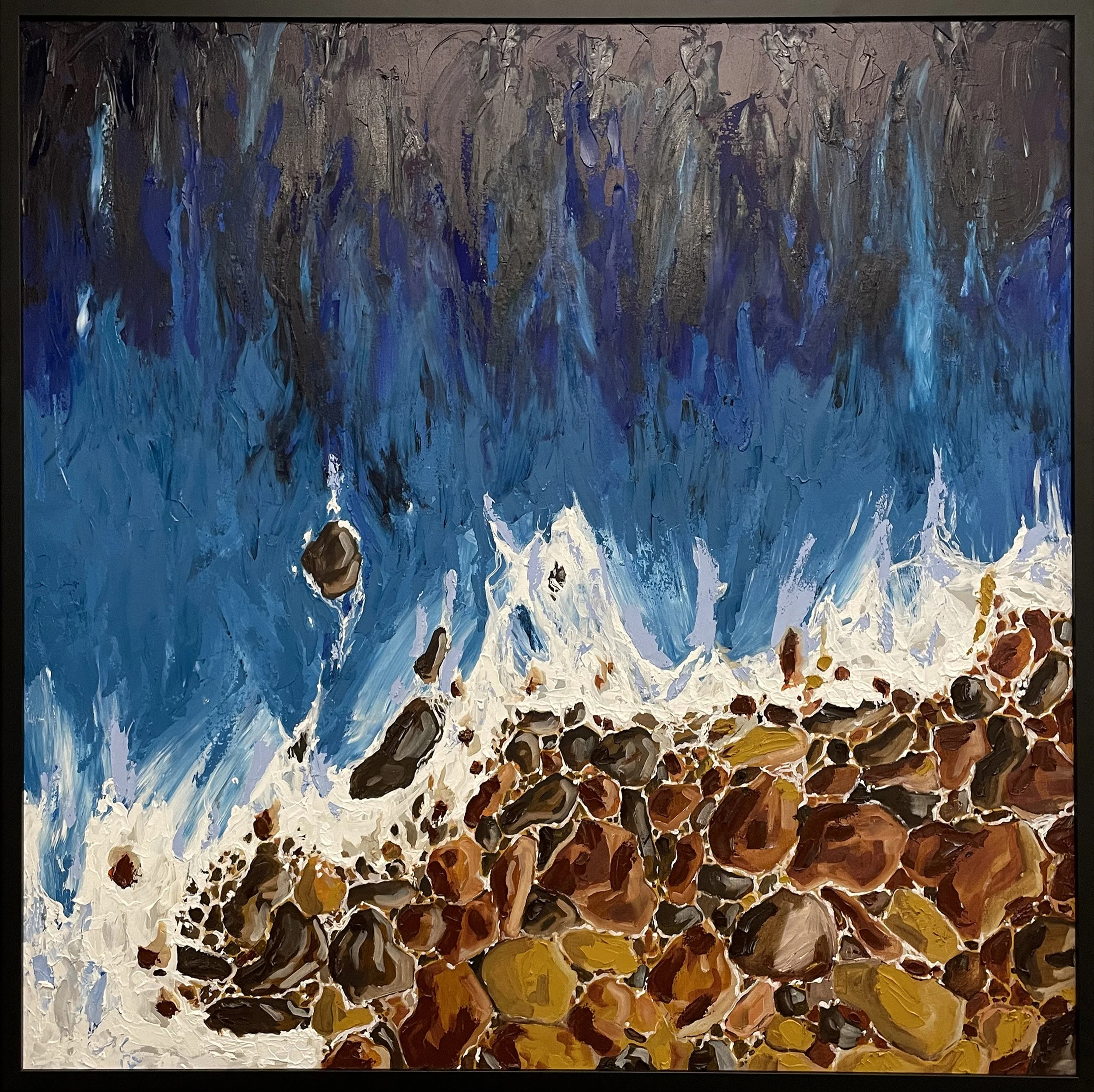 Tide pools is a painting depicting the waves reaching the shoreline of a beach. The perspective looks down at the water weaving through each of the rocks, and you can see the gradient of blue water washing back out to sea. This piece was created using nothing but a palette knife and my point paints. I love creating art related to the water, motion, the beach, and Hawaii as they are central things that I love.