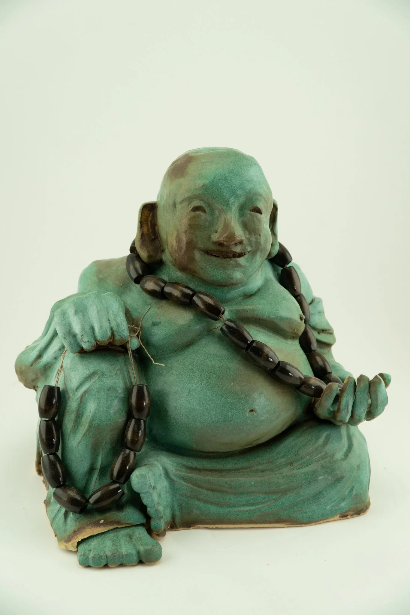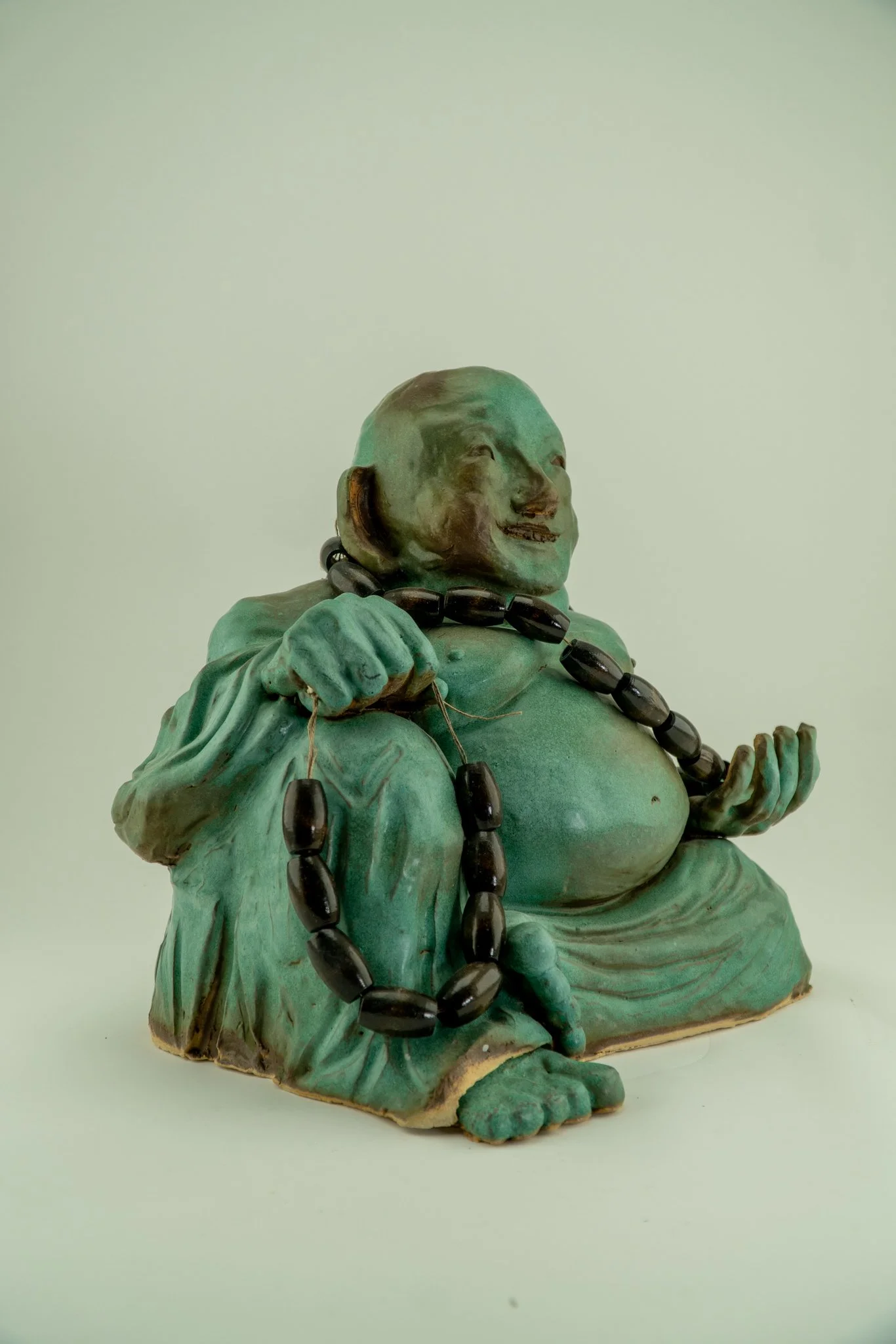 I was extremely pleased with the outcome of the final form. I used a cyan glaze and dark brown polished beads with rope. I constructed the necklaces with twine and wood, and they are made to resemble meditation beads commonly held by the Jolly Buddha.