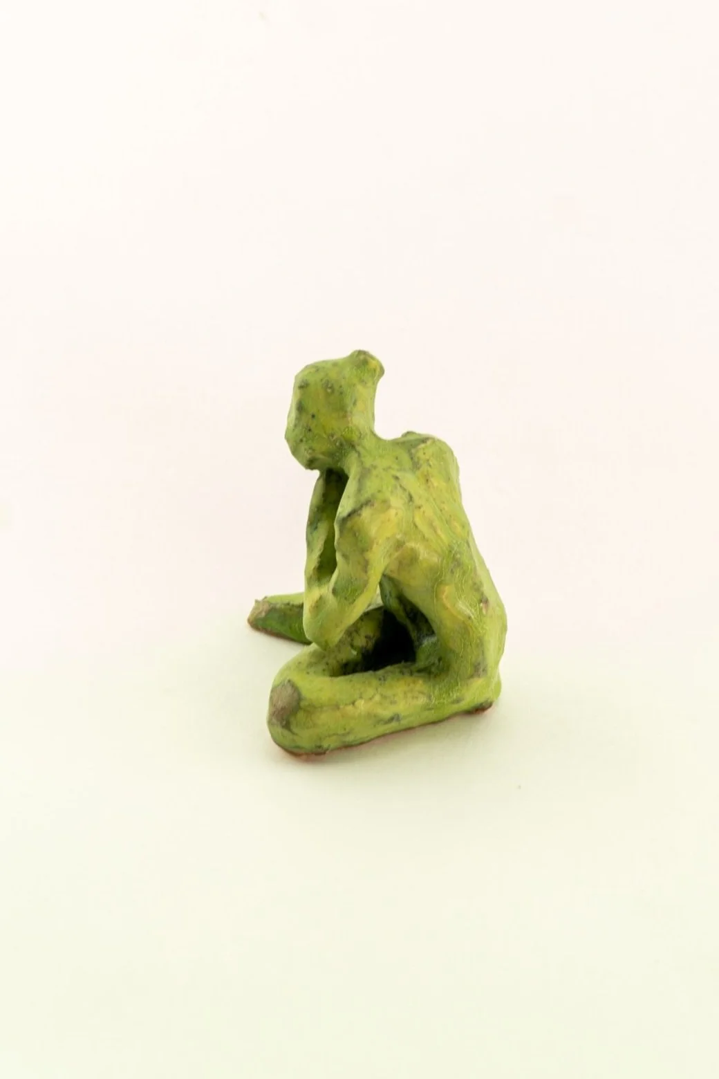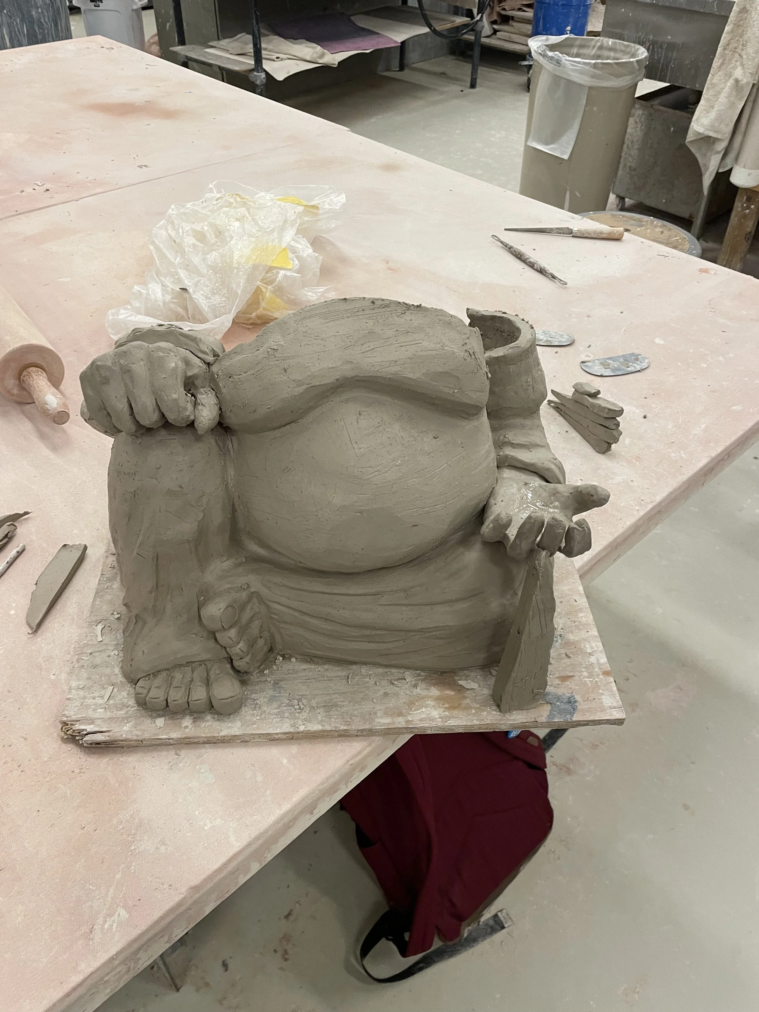I had constructed smaller mock ups in order to gauge the proportions of the final form, though this is a photo of halfway through the construction of the final. I created the piece by building the fingers and hands separately; then coiling the piece up to create the body and belly. The whole piece was constructed using coils and then created additively. The construction of the head and face was certainly the biggest challenge I struggled with. I had constructed it 3 separate times, and started over, though the final time I switched from coil construction to slab building. This allowed me to get the head shape right first before constructing the features on the face.