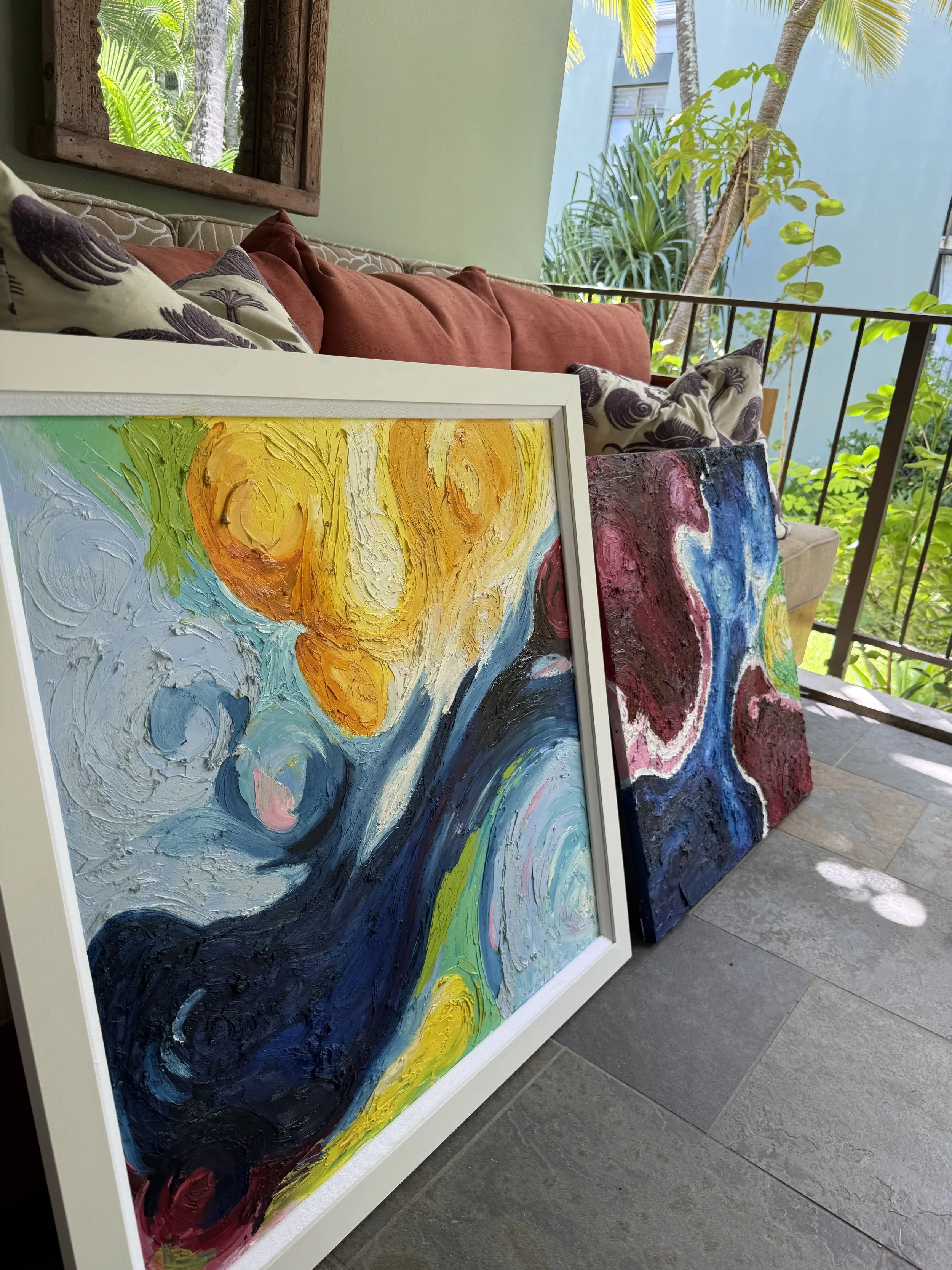 Hawaiian Sky, among with other similar pieces in this portfolio are abstracted, impressionist paintings created and sculpted to their shape with a palette knife. This composition was creating using all of the colors seen in a sunset viewed from the same balcony where this painting is pictured. Connecting to and paying respect and attention to these beautiful moments and forces of nature is something I desperately want to continue moving forward in my practice.