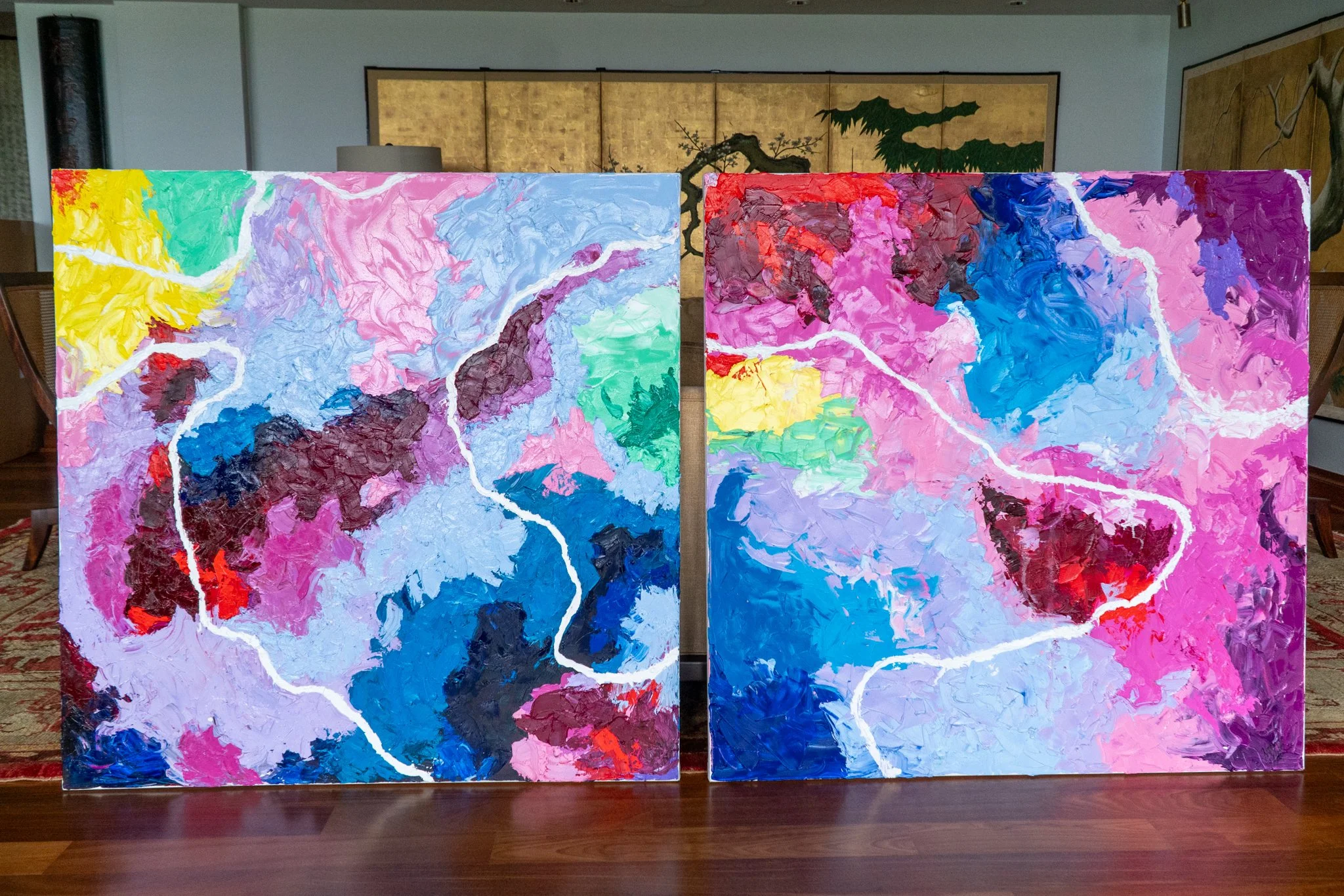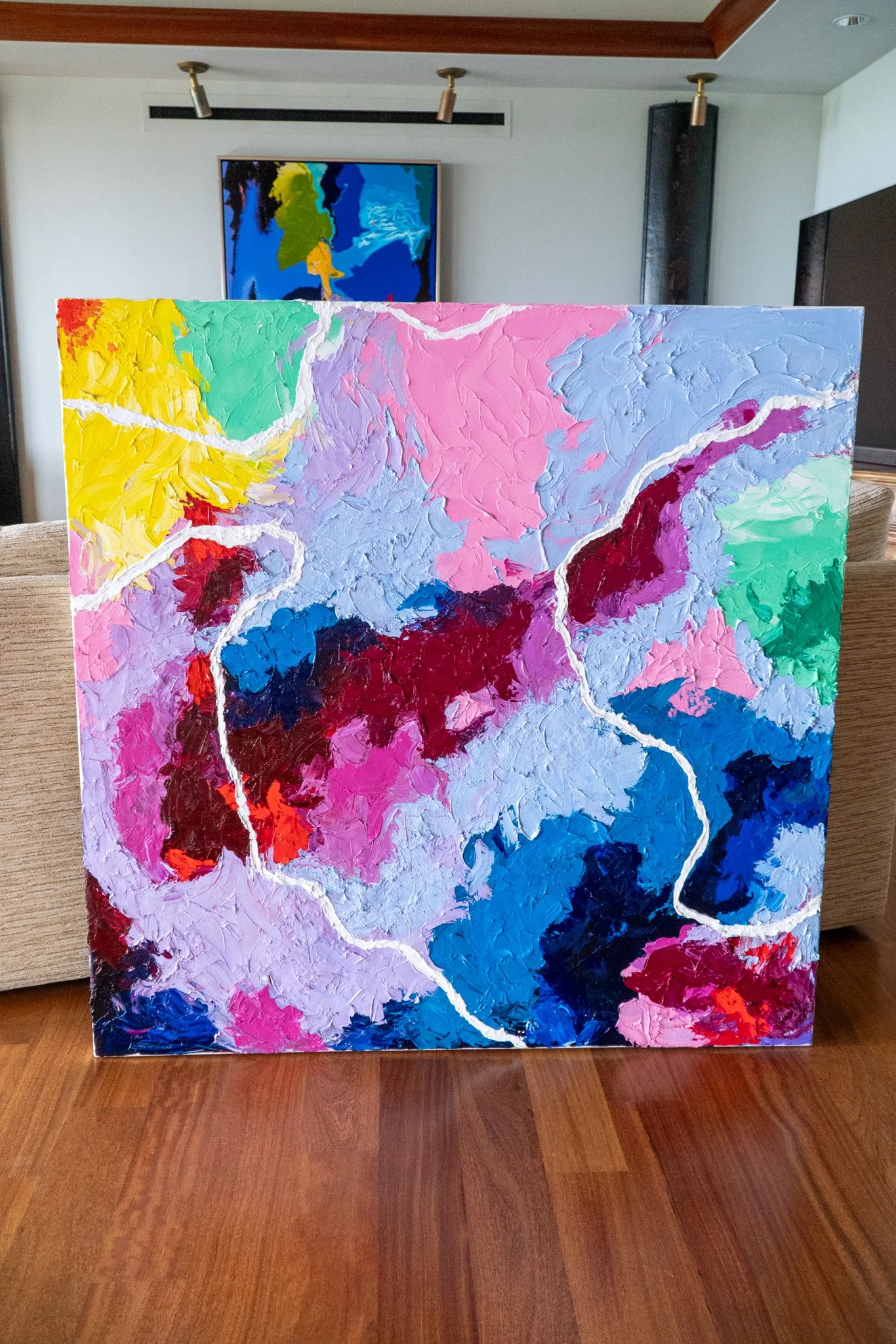 Featuring my favorite color palette of 2022, Seabreeze Sonata became a big, messy, wonderful experiment in movement. I created the entire piece using only a palette knife, which pushed me to work more instinctively than I usually do. The paint sits thick on the canvas, dragged and layered in a way that lets the colors blend, scrape, and break apart. Nothing is overly planned—each pass of the knife follows the energy of the moment, building an abstract rhythm that reminded me of shifting tides and gusts of wind. It’s a large piece, and part of the experience is getting up close to see all the ridges, scratches, and unexpected mixes of color that happened along the way.