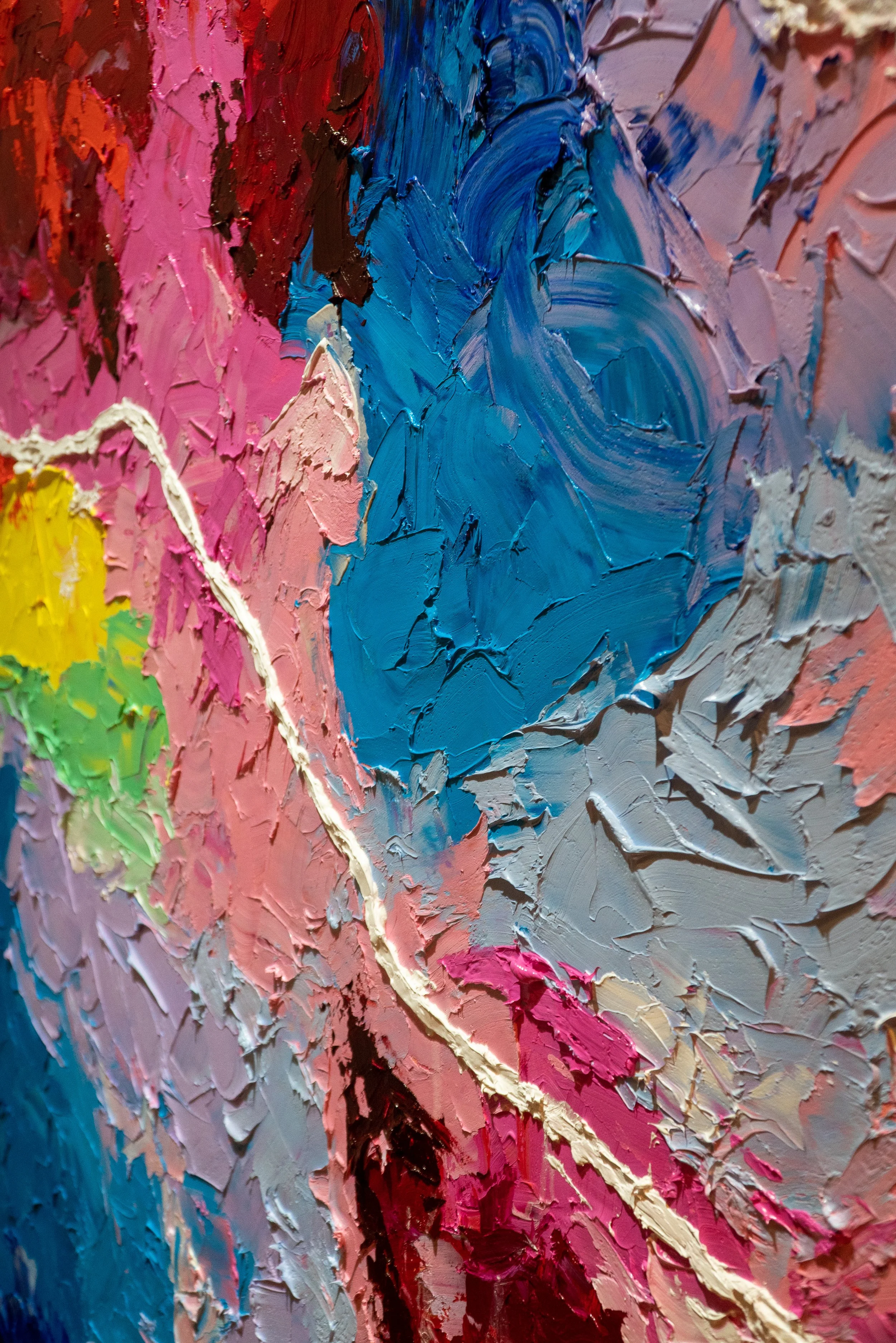 This bold, abstract oil painting bursts with vibrant hues, where thick layers of paint are carved and sculpted with a palette knife. Somehow ‘Head in the Clouds’ makes itself strong, while maintaining a softness. The bold strokes of soft, pastelly pinks and blues clash with the zesty yellows. Dynamic collisions, and textured strokes seem to leap off the canvas towards the viewer. Deep grooves and raised ridges create a tactile, almost sculptural effect, contrasting with the glossy, smooth surfaces of untouched pigment. The colors swirl and blend in passionate, fluid motions, shifting from popping bright tones to cool, calming blues. The intense texture and vivid palette bring the painting to life, inviting the viewer to both see and feel the energy within the canvas.