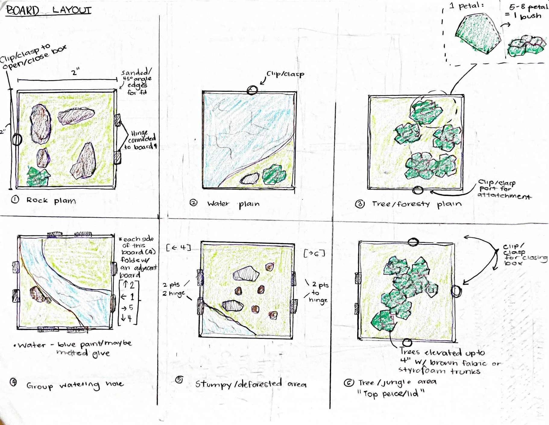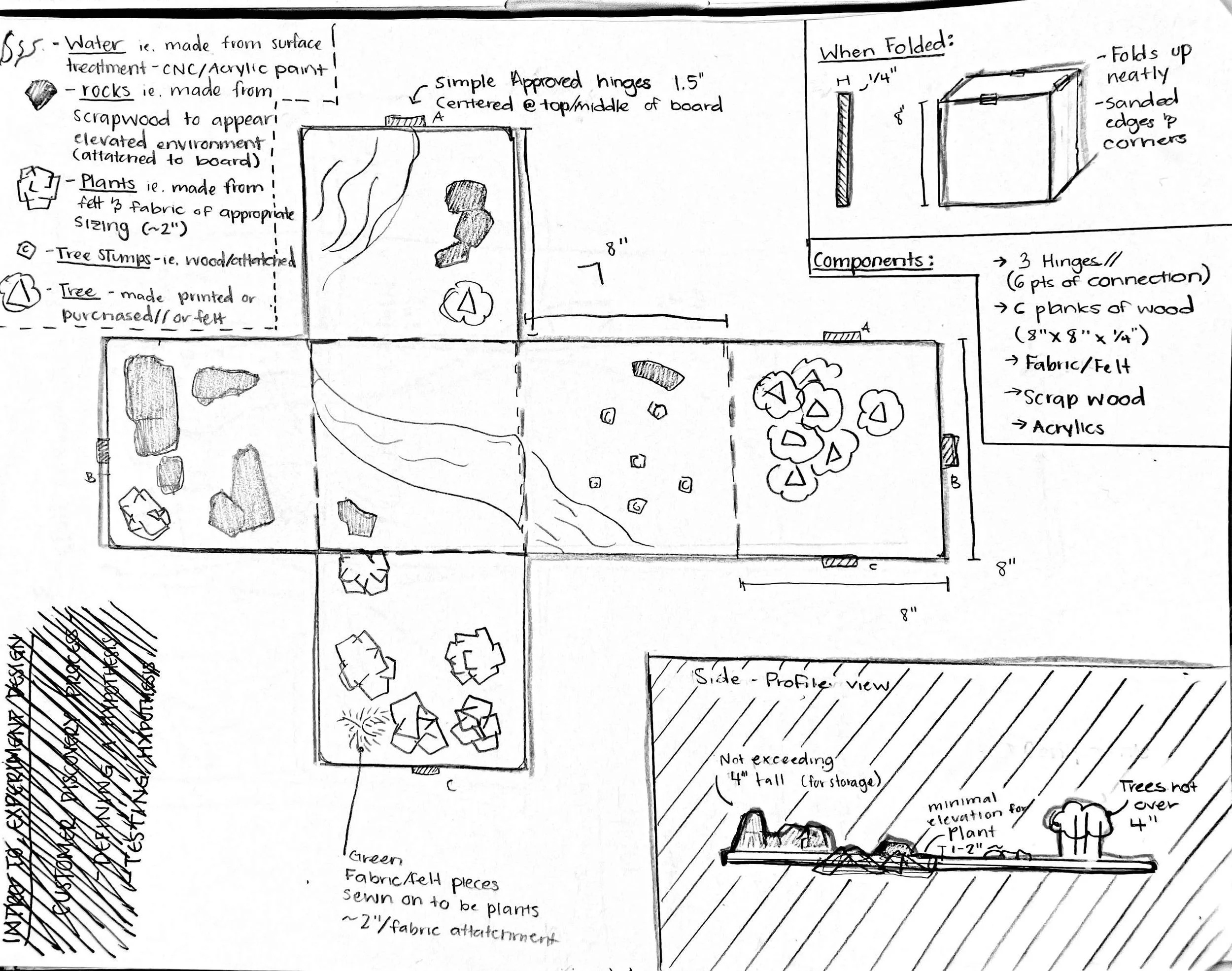 We made multiple sketches of our jungle play set. The sketches made included - freehand sketches, schematic sketches, orthotic sketches, and other concept renders. We envisioned a board that would open up into a beautiful environment, but when it came time for clean up, the play-set would fold nicely and neatly into itself.