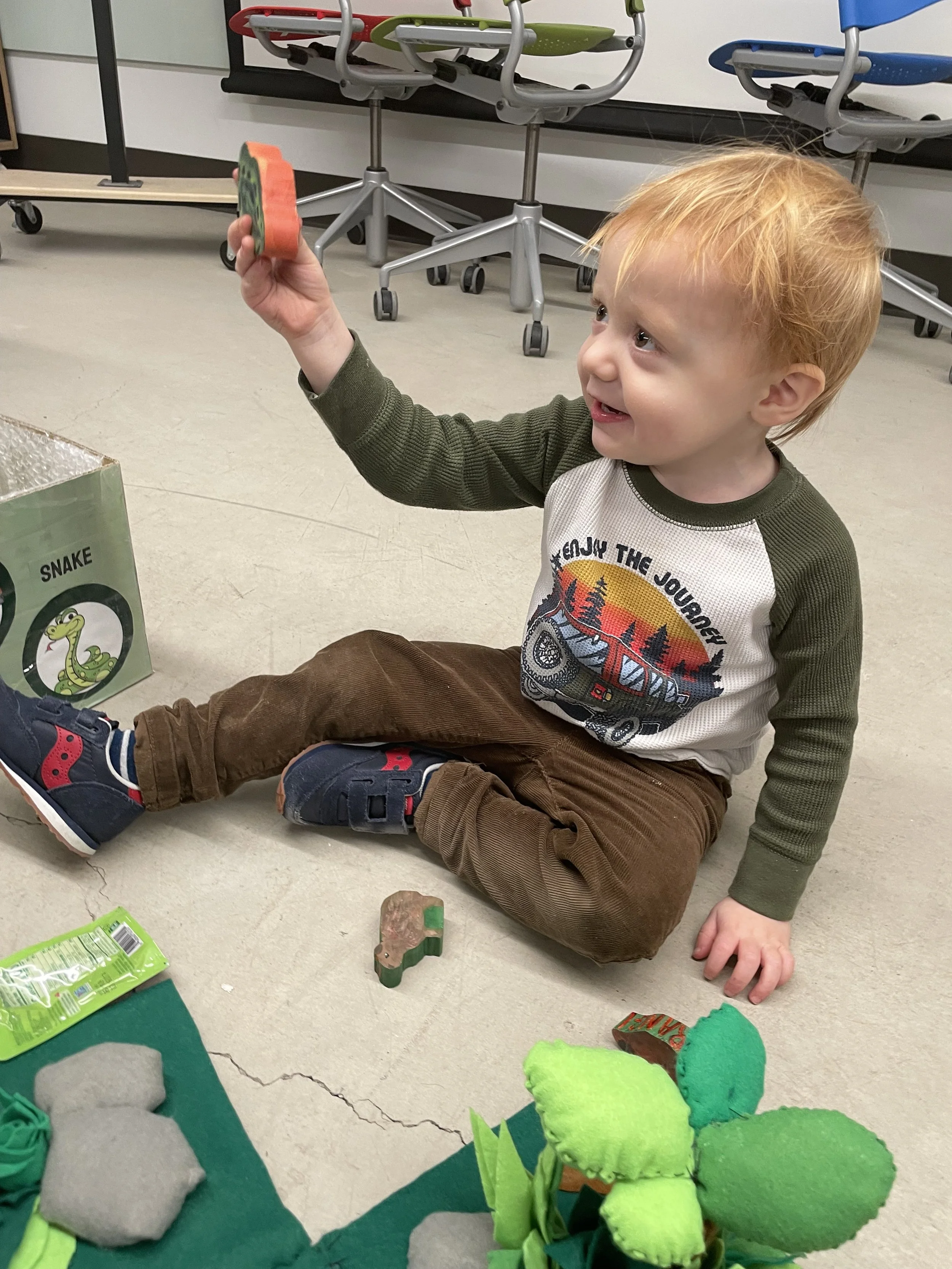 We conducted user testing with the product to find out how our target customers would interact with the toy in its final form. Jasper, our participant in the photo, is a 2 year old who came in and served as a case study. A parent was also there to oversee jasper’s playtime with our product. We interviewed the parent on their opinion of the toy, and observed Jaspers interest levels. The testing was a success! We had lots of insightful data from Jasper and tons of positive feedback from Jasper’s parents. Not only is this a product that can do well with both passive and active forms of playtime, but it encourages creativity and playtime spent with nature and animals, rather than screen time.